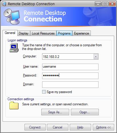 On your laptop, bring up the Remote Desktop Connection tool (Start, All Programs, Accessories, Communications, Remote Desktop Connection). You’ll see a window like this:
