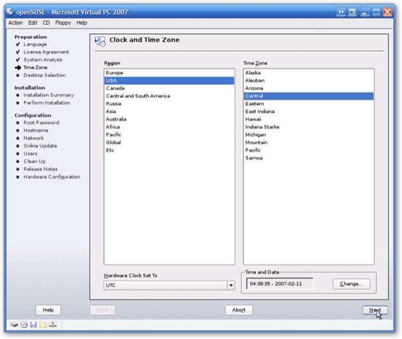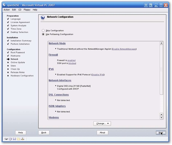 When it’s done examining, you’ll be ready to click Next. Note one item, there have been some issues with openSUSE not detecting the sound card of Virtual PC 2007. If sound is extremely critical to you, consider sticking with either VPC 2004, or drop back to openSUSE 10.1.