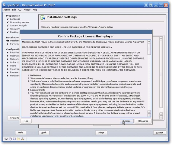 This is where the folks at Novell like to play an April Fool joke, in that you only thought you were done with license agreements. In the 10.2 version I downloaded, I’m additionally asked to confirm the licenses for some Adobe product and the Flash player. I clicked OK on both.