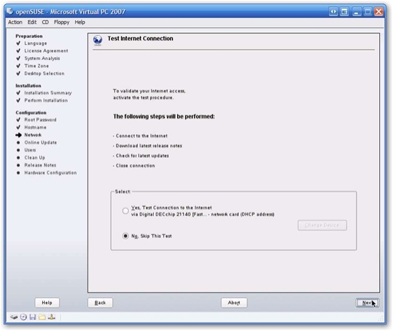 Finally, out of desperation, I clicked the Back button to return to the screen below, then told it to skip the test, and go on. By golly, it actually worked just fine! I guess the problem is on the Novell end, as openSUSE happily proceeded to download all sorts of online updates with no problems. Your experience may vary a little, but if you try the test and it fails, try using the Back button, tell it No, skip the test, and go on from there. I’m betting it’ll work OK for you too.