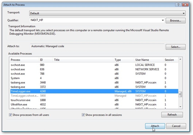 Now comes the neat part. Under the Debug menu in Visual Studio, select “Attach to process…”. When the dialog below appears, you will need to check the “Show processes from all users” and “Show processes in all sessions” boxes. Now your list should update correctly.