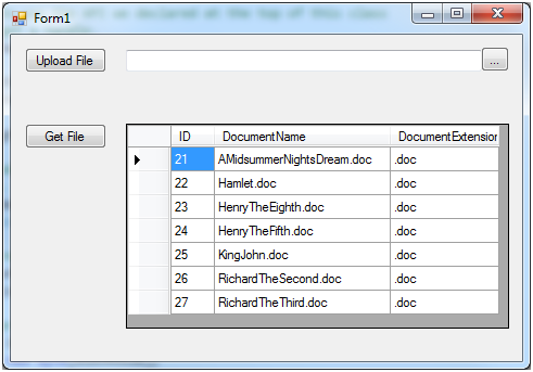 The grid is a Data View Grid that shows the ID and Document information from the table we previously created. (If you want to see the code to populate the grid see the project.) The user picks a row, then clicks on the Get File button.