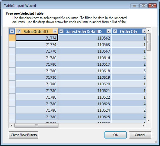 Here you can see a subset of your data, only the first few rows. It’s enough to give you an idea of what the data looks like, but it won’t show you every single row. Considering the fact that PowerPivot is capable of importing millions of rows, this is probably a good thing.