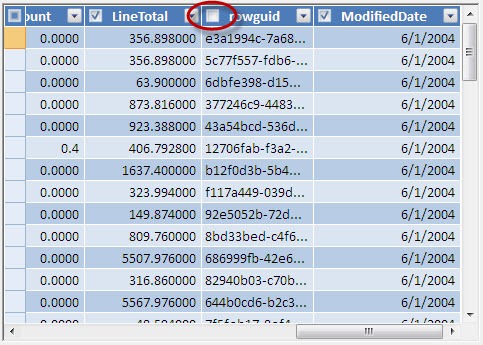 Within this dialog we can do some pretty powerful things. Let’s start by eliminating a column we don’t need in the data we want to import. Scroll to the right until you see the rowguid column and uncheck the box next to the column header, as you see below.