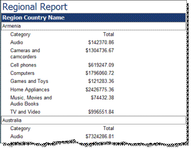 Use a tabular report, move the RegionCountryName to the details area, and pick Corporate for the style. Finally, for the name use “Regional Report”.