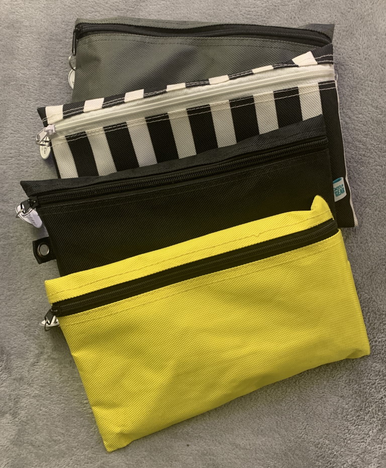 These bags are inexpensive, typically around $3, come in a variety of colors, and hold a lot. Each laptop I have has a bag associated with it, which holds the power supply plus any extra cables I use with it.