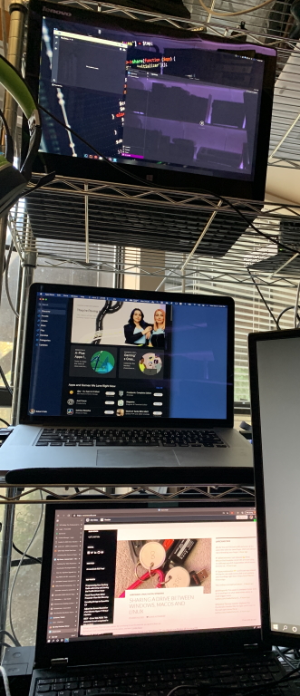 I use multiple laptops, as I work in multiple environments. I have a Lenovo P51 on the bottom, in the middle is my Apple MacBook. On top is another Lenovo that I am running Linux Kubuntu KDE Neon on.