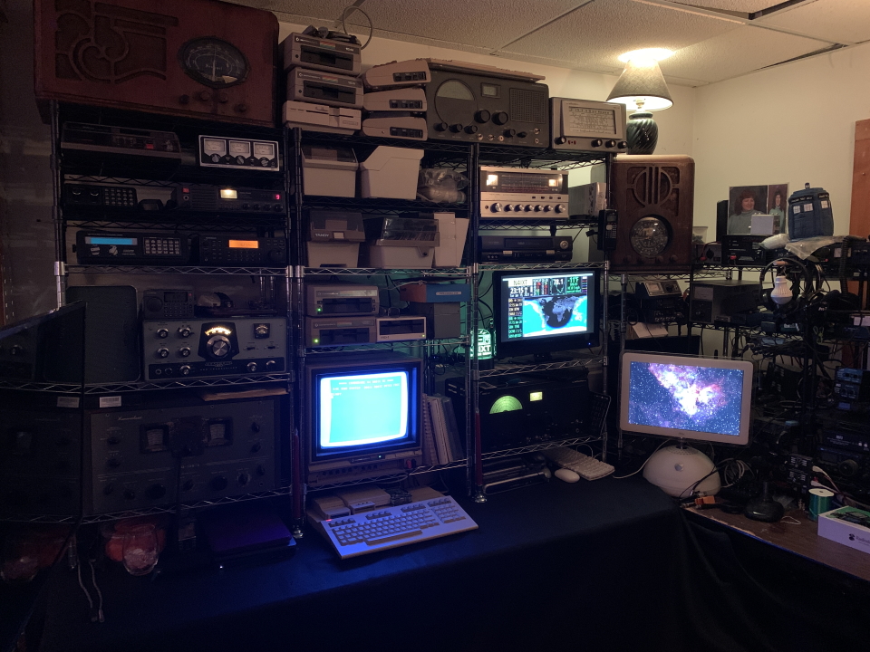 The wire racks on the back wall hold my antique radios as well as some of my “antique” or classic computers like my Commodore 128 or the older “egg bowl” Mac. To the right of the Mac are my modern ham radios.