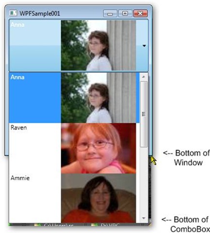 I realized in my last post on WPF ListBoxes I overlooked a basic concept, how to make the ListBox scroll when there’s more items than can fit. Let’s return to the code from Monday, but resize the Window so only the top two pictures show. Running the app doesn’t change anything, the top two still show with no way to scroll down.