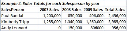 In BI terms, the names of the sales people are a dimension. Dimensions are often either a “who” (who sold stuff) or a “what” (what stuff did we sell). Places (where was it sold) and dates (when was it sold) are also common dimensions. In this case the sales dates across the top (2007, 2008, 2009) are a date dimension. When we use two or more dimensions to look at our measures, we have a pivot table.