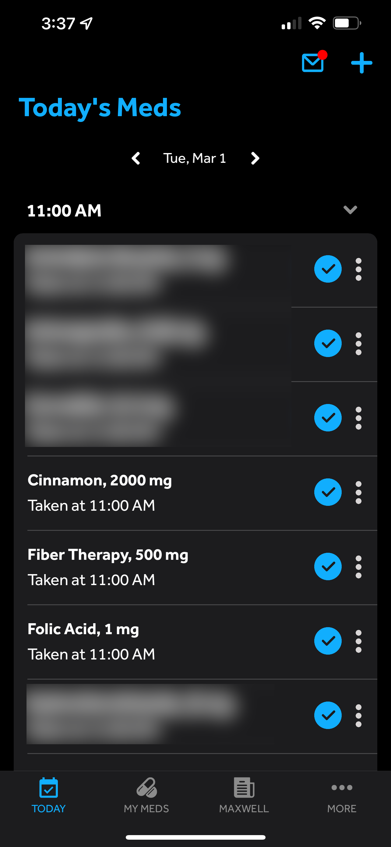 Note I’ve blurred out my prescription meds, but you can also enter your vitamins into the app to track them. When the reminder alert goes off, you can tell the app you took the meds on time, just now, or enter a specific date/time.