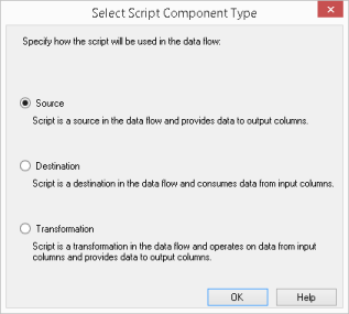 Next, drag and drop a Script Component transformation onto the Data Flow design surface. When prompted, change the component type to Source.