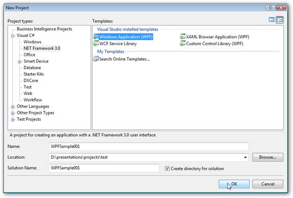 OK, that covers the various WPF project types. For today, we’ve decided on a standard WPF Windows Application, so click OK as you see in the screen above.