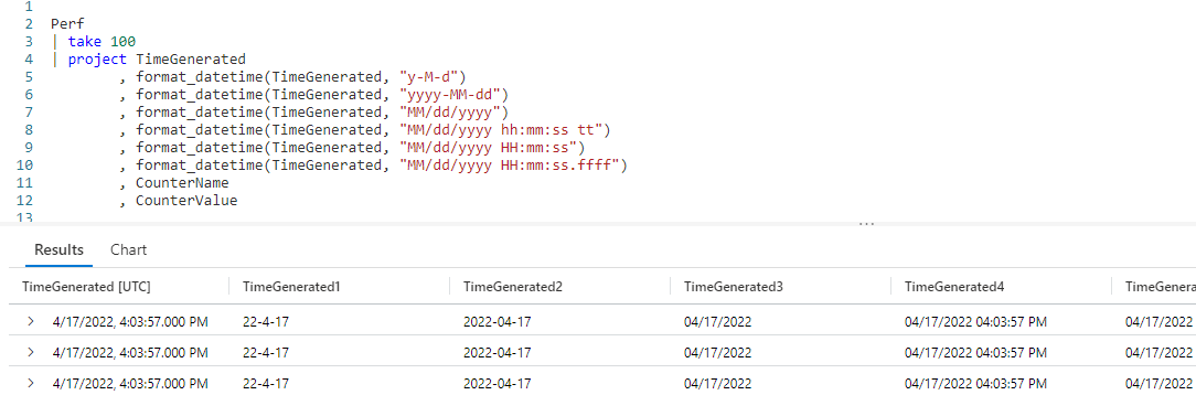 Note that my output may not look exactly like yours when you run the sample queries for several reasons. First, Microsoft only keeps a few days of demo data, which are constantly updated, so the dates and sample data won’t match the screen shots.