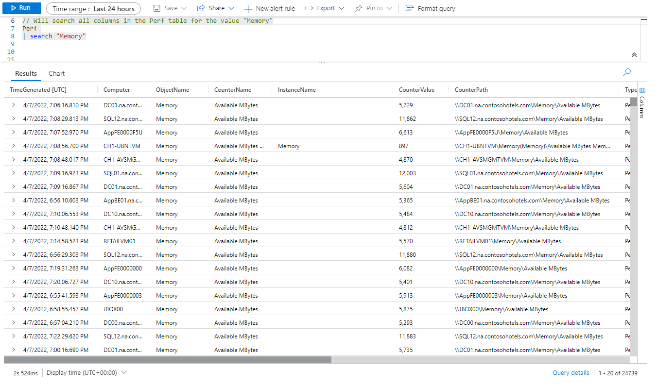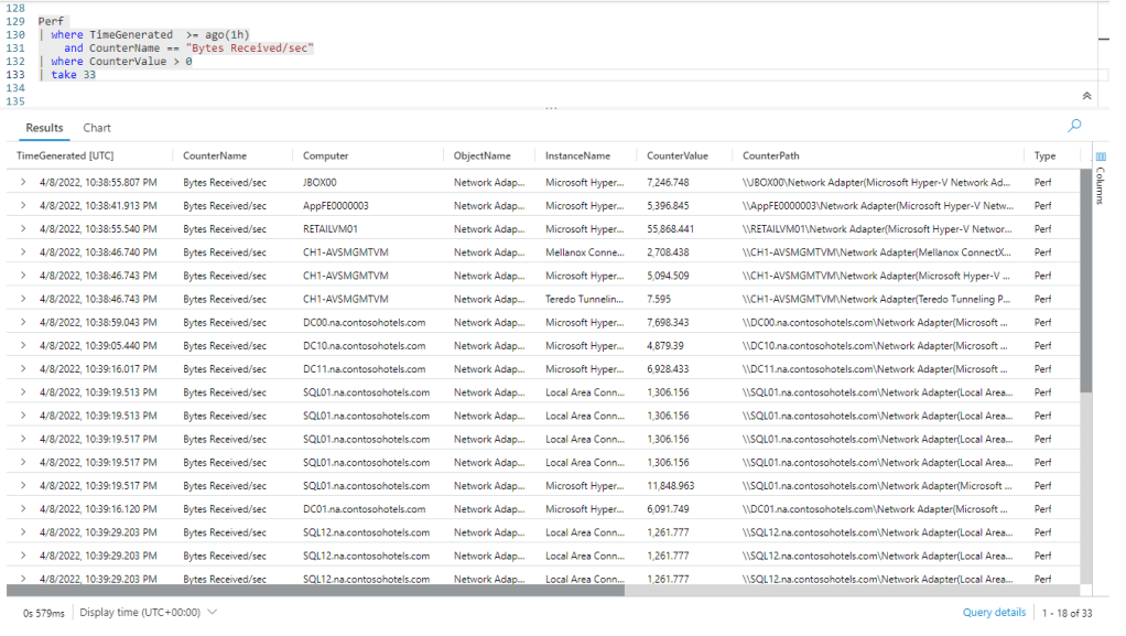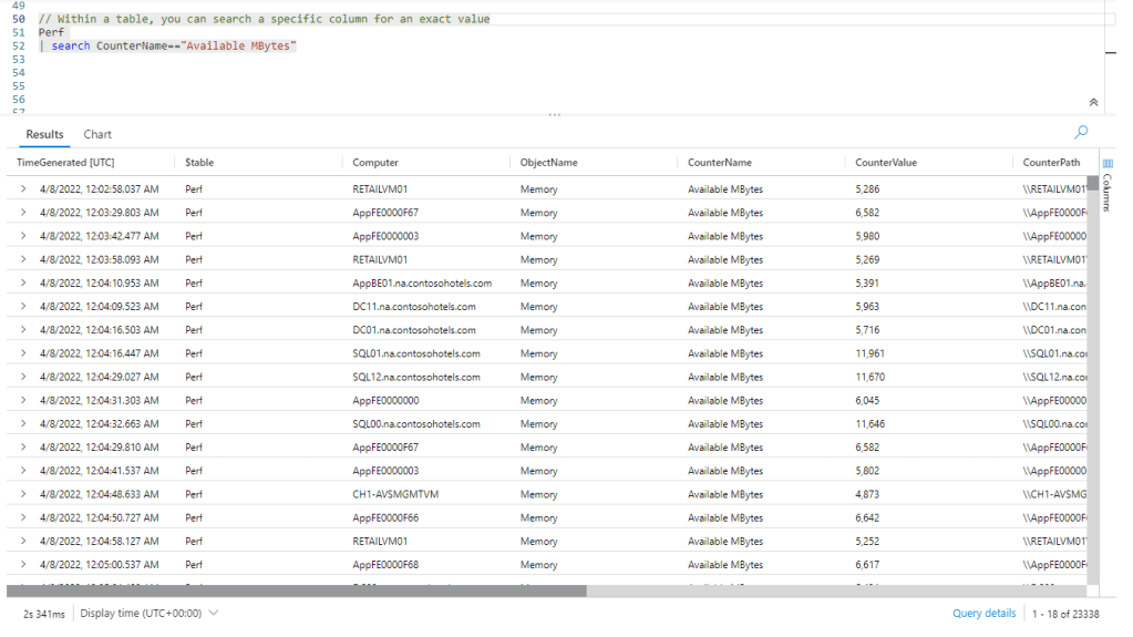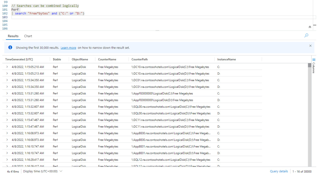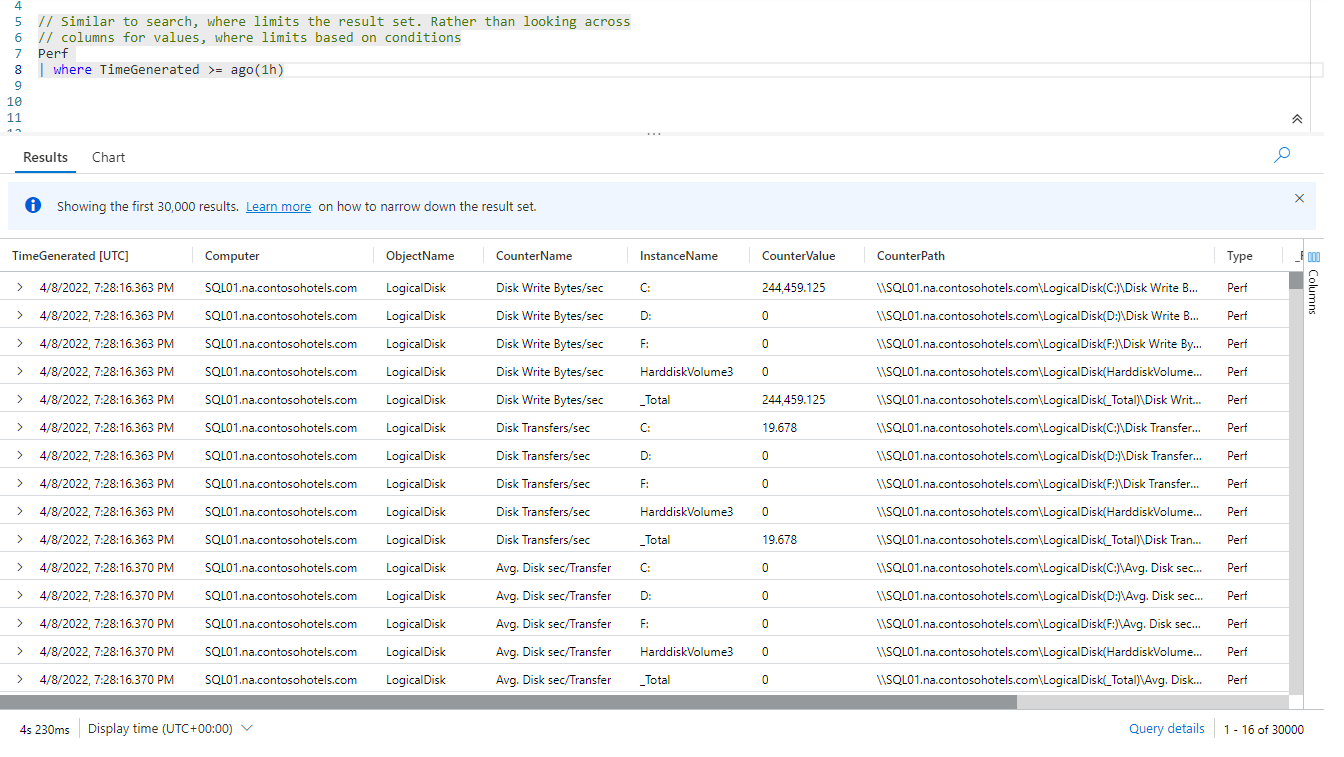 Note that my output may not look exactly like yours when you run the sample queries for several reasons. First, Microsoft only keeps a few days of demo data, which are constantly updated, so the dates and sample data won’t match the screen shots.