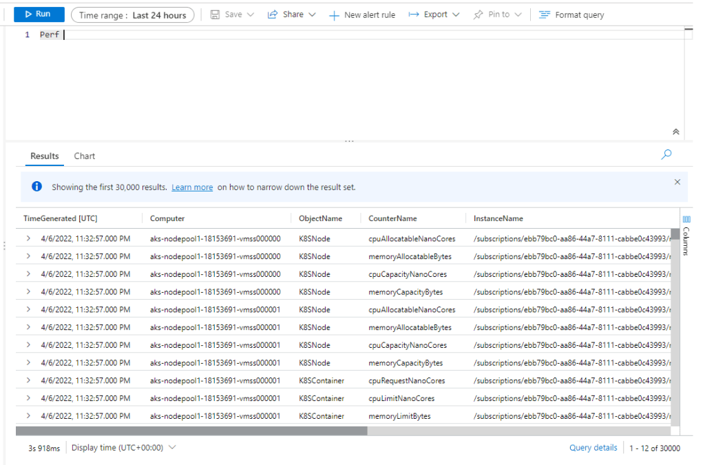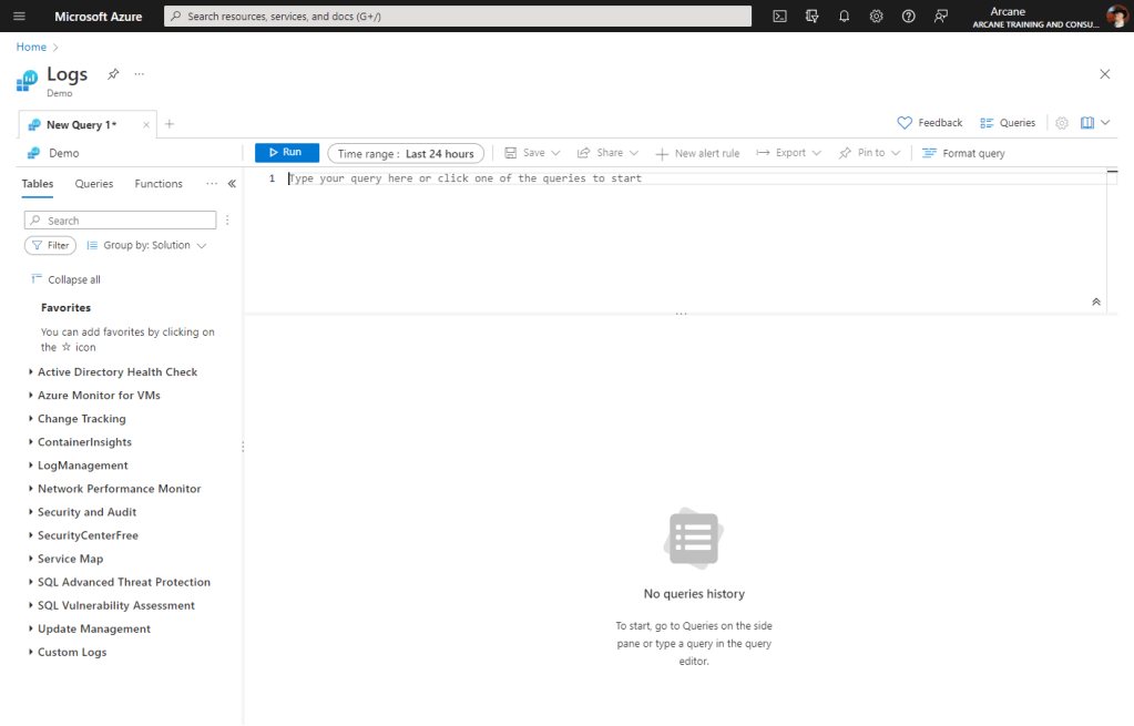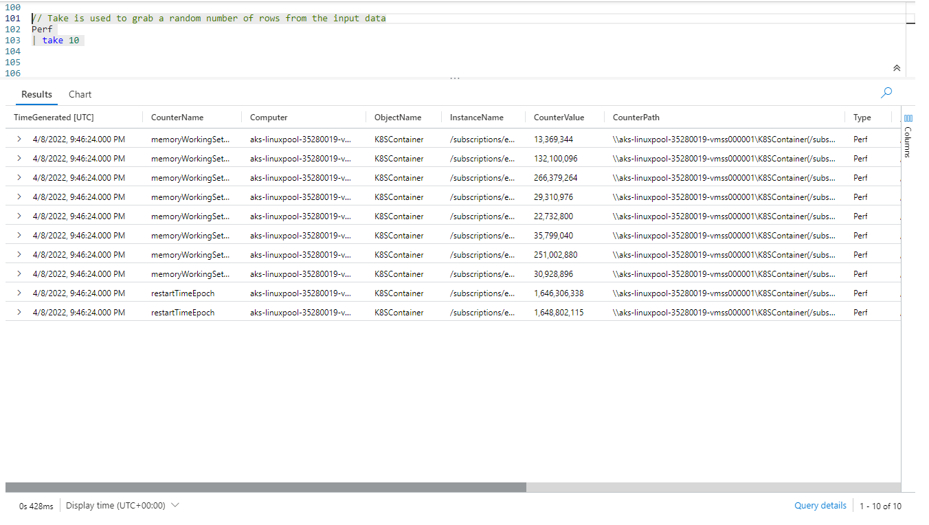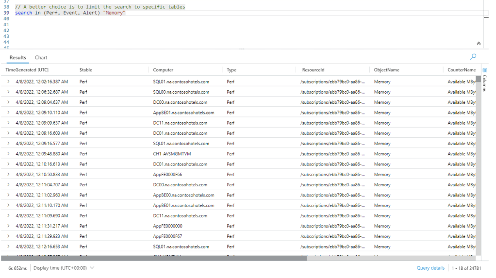 Note that my output may not look exactly like yours when you run the sample queries for several reasons. First, Microsoft only keeps a few days of demo data, which are constantly updated, so the dates and sample data won’t match the screen shots.
