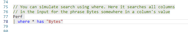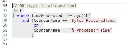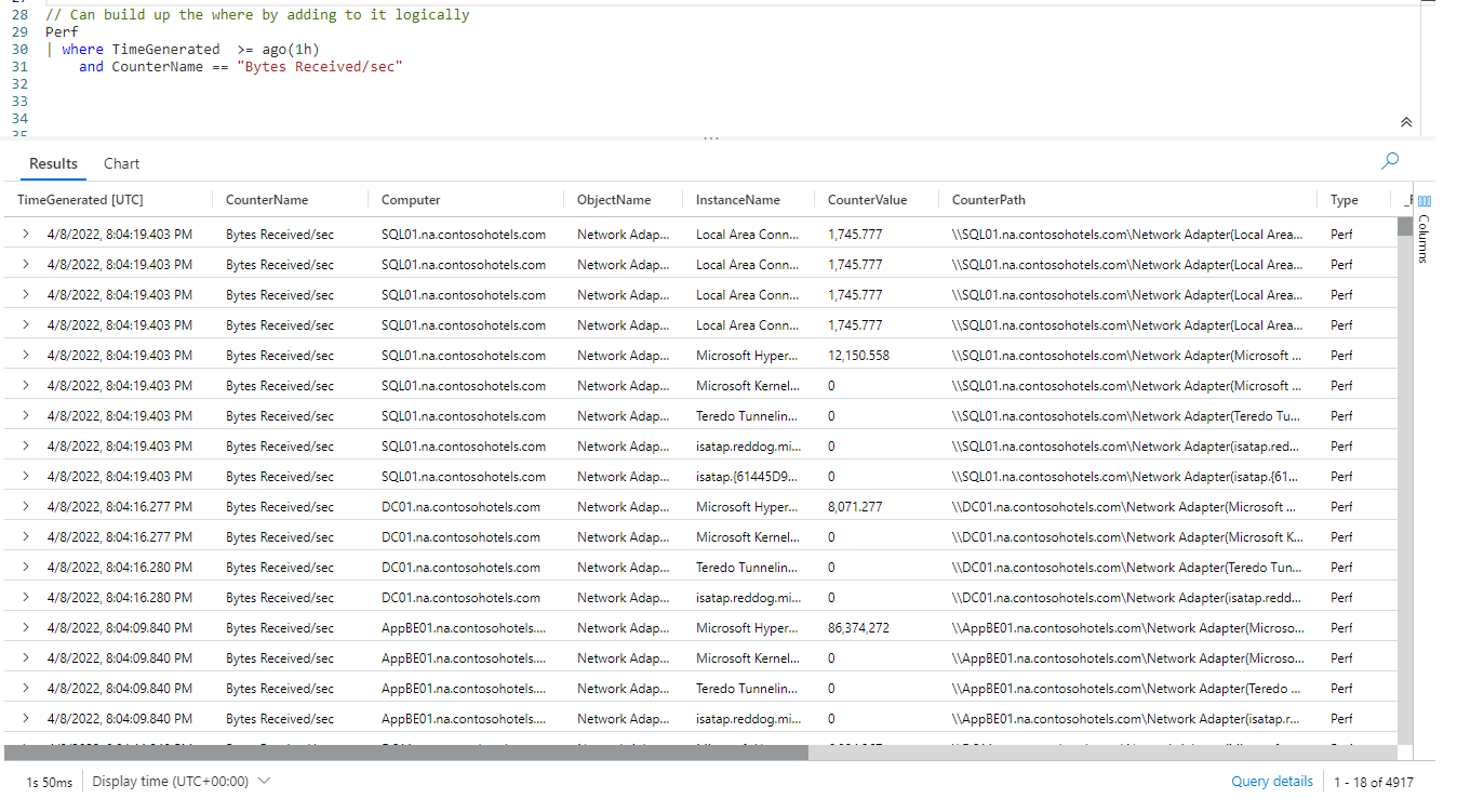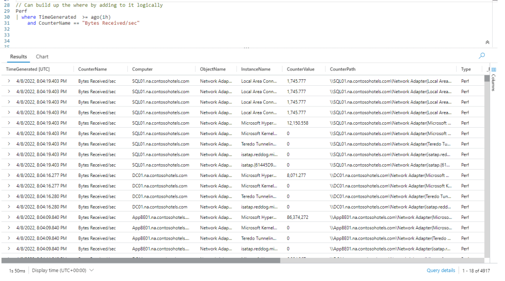 One last item. You can actually omit the name for a new calculated columns. We could have just used extend CounterValue / 1000 if we wanted. However this will generate the new column with meaningless names like Column1, Column2 and so on. I highly advise giving all your calculated columns a name, even on simple queries.