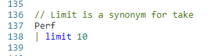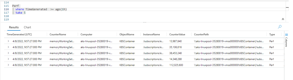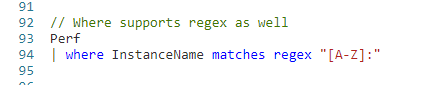 In our Perf data, the ObjectName and CounterName columns are closely associated. In order to reduce the number of columns in our output, it would be nice to combine these into a single column. To do that, Kusto provides the strcat function.