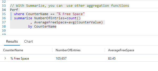 If you read my article Fun With KQL – Summarize, specifically the section titled Code Formatting Note, you’ll know the formatting of KQL code is extremely flexible. I placed the new calculation on the next line, and put the comma at the start of the line. Kusto would have been just as happy though if I’d put the comma at the end of the FreeGB line, or put everything on a single line.