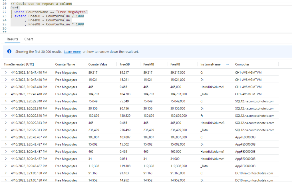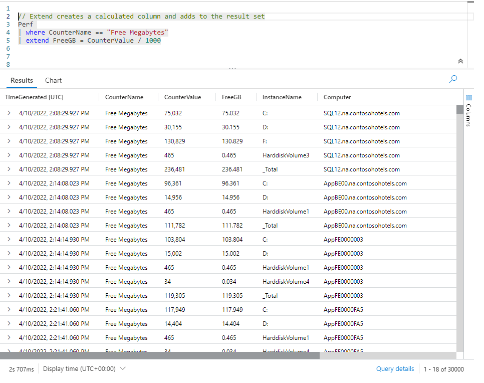 In the example we use the extend operator, followed by the name for our new column, FreeGB. Then comes an equal sign, and our calculation. To convert Megabytes to Gigabytes we’ll simply divide the CounterValue by 1000.