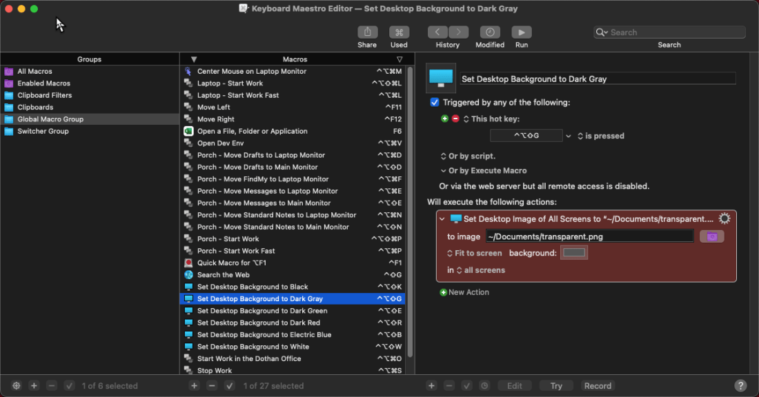 Now you can repeat this, adding additional macros for each color you want to add. I have macros for dark gray, green, dark red, blue, and a light gray almost white in color. Normally I use dark gray for my "business" spaces, blue for my development spaces, and dark red or dark green for the third desktop space, depending on my mood. I can also change easily if lighting conditions would make a certain color easier to on my eyes.