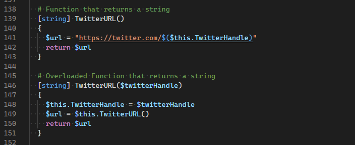 At the top is our original function. Below it is the overloaded version. In it I pass in a single parameter, the $TwitterHandle. PowerShell can use this to determine which version of the function to call.